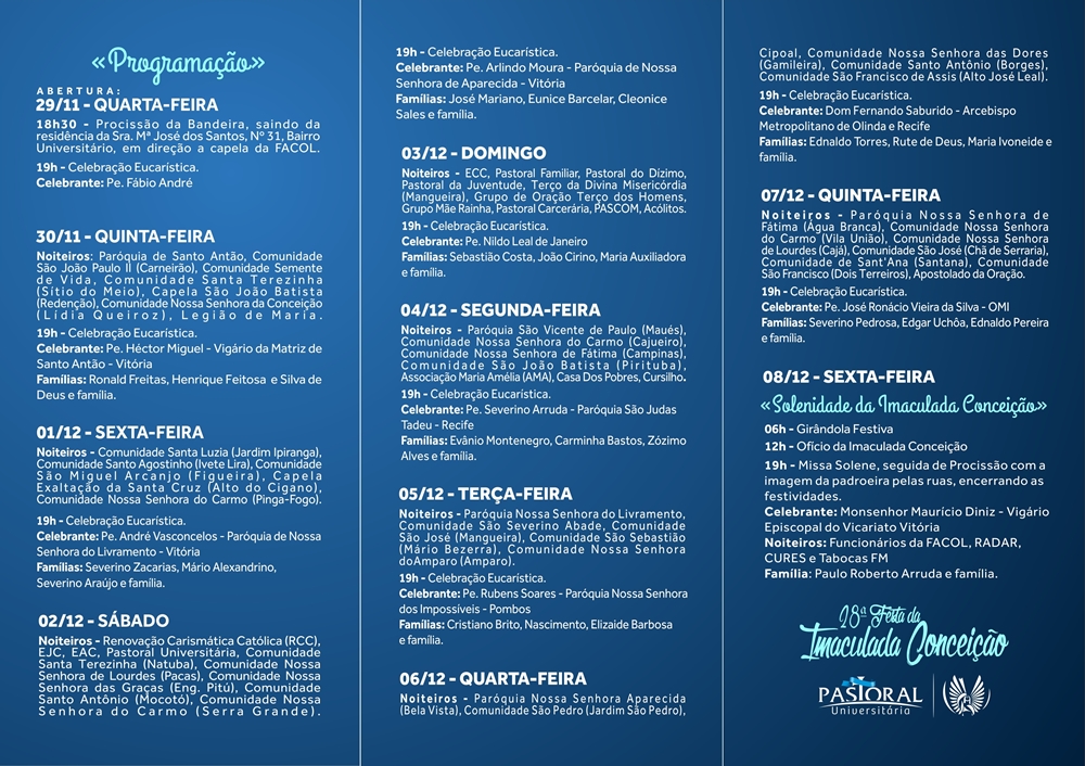 A programação conta com missas, recitação do terço e da novena, todos os dias. “Maria, exemplo de fé e discipulado para a vida acadêmica” é o tema deste ano. A abertura ocorre com a procissão da bandeira, saindo da residência do Bairro Universitário, em direção à capela da FACOL. Após o cortejo, o padre Fábio André celebra a primeira missa do novenário.