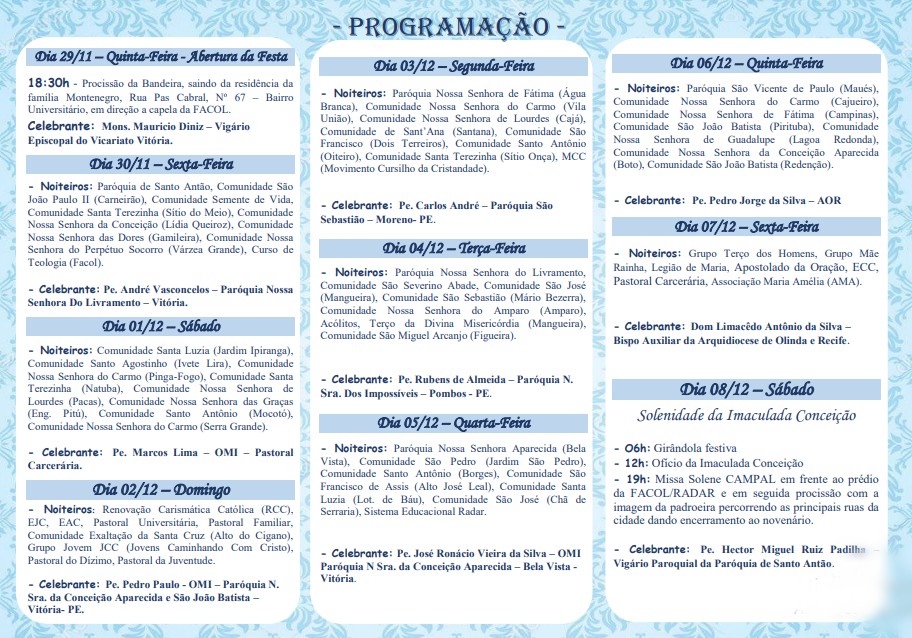 A programação conta com missas, recitação do terço e da novena, todos os dias. “Com Maria e a Pastoral Universitária evangelizaremos o mundo” é o tema deste ano. A abertura ocorre com a procissão da bandeira, saindo da Rua Paes Cabral, Bairro Universitário, em direção à capela da FACOL. Após o cortejo, o monsenhor Mauricio Diniz celebra a primeira missa do novenário.