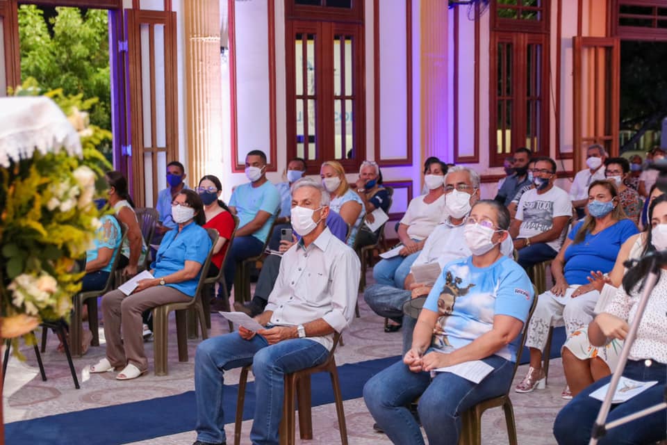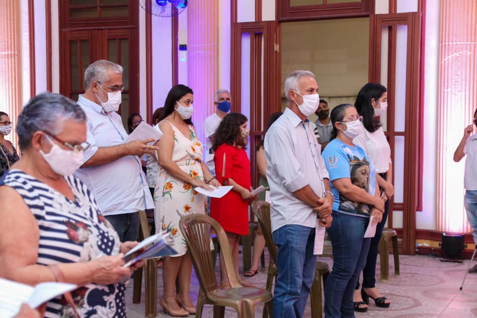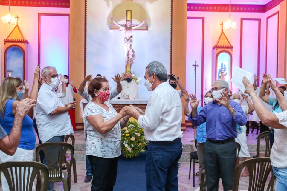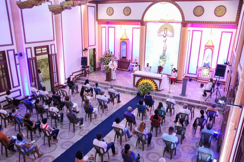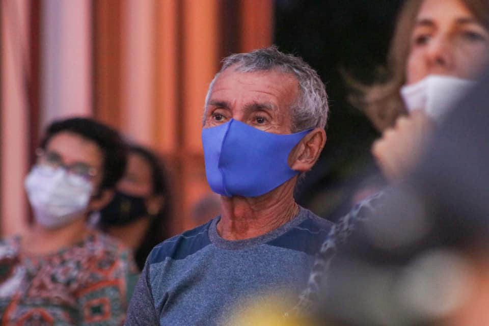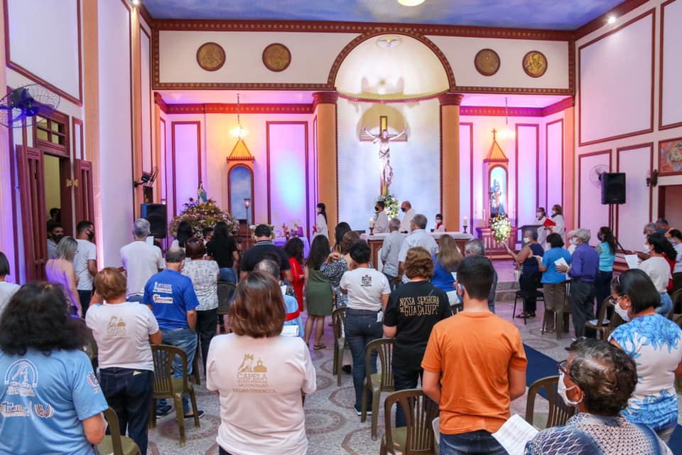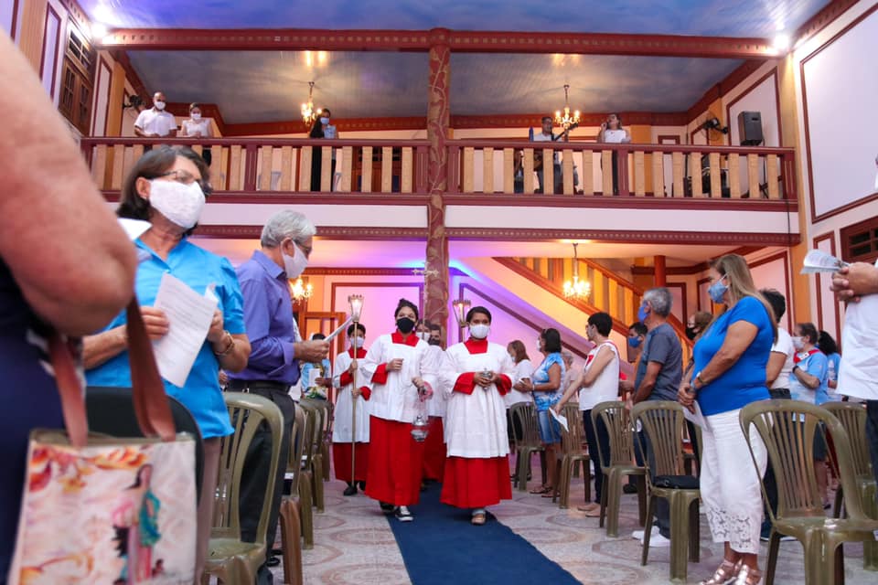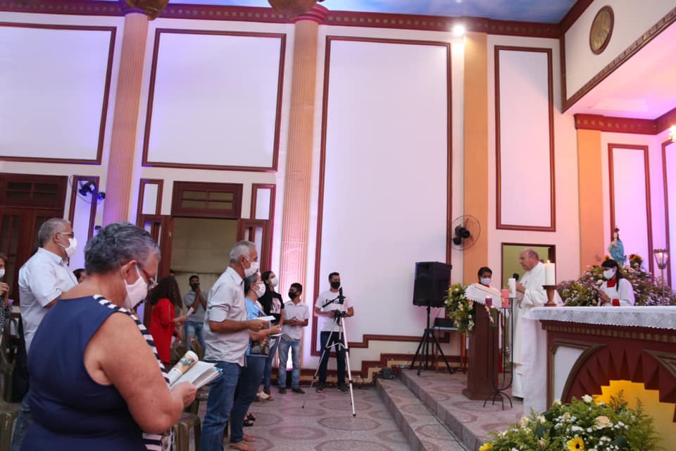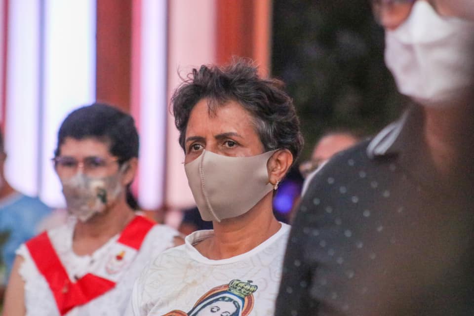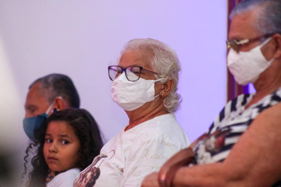 Devido à pandemia da Covid-19, os fiéis tiveram que seguir protocolos de segurança, como uso de máscara, distanciamento e higienização das mãos com álcool gel.